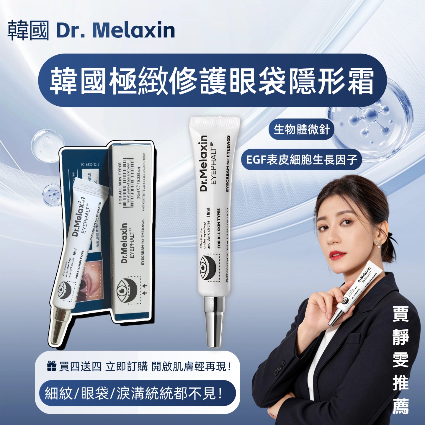韓國 Dr. Melaxin 實驗室研發,Eyephalt 賈靜雯推薦極緻修護眼袋隱形霜 讓你眼袋隱形,年輕再現! 臨床數據見證,效果驚人! 只需一次使用,眼袋提升高達 156.67% 眼周皺紋改善高達 121.32% EGF表皮細胞生長因子 + 生物體微針,強效修護眼周肌膚!